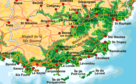 Cavalaire sur Mer, Cavalière, Le Lavandou, Bormes-les-Mimosas, La Londe-les-Maures, Hyères, La Garde, La Vallette-du-Var, Carqueiranne, La Crau, La Farlède, Le Pradet, Solliès-Ville, Solliès-Pont, Solliès-Toucas, Pierrefeu-du-Var, Cuers, Belgentier.